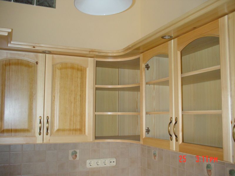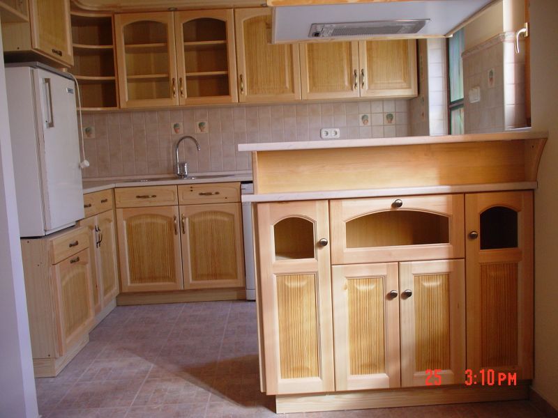 Konyhabútor borovi fenyő ajtókkal, furnérozott betétekkel. Asztalos munka |