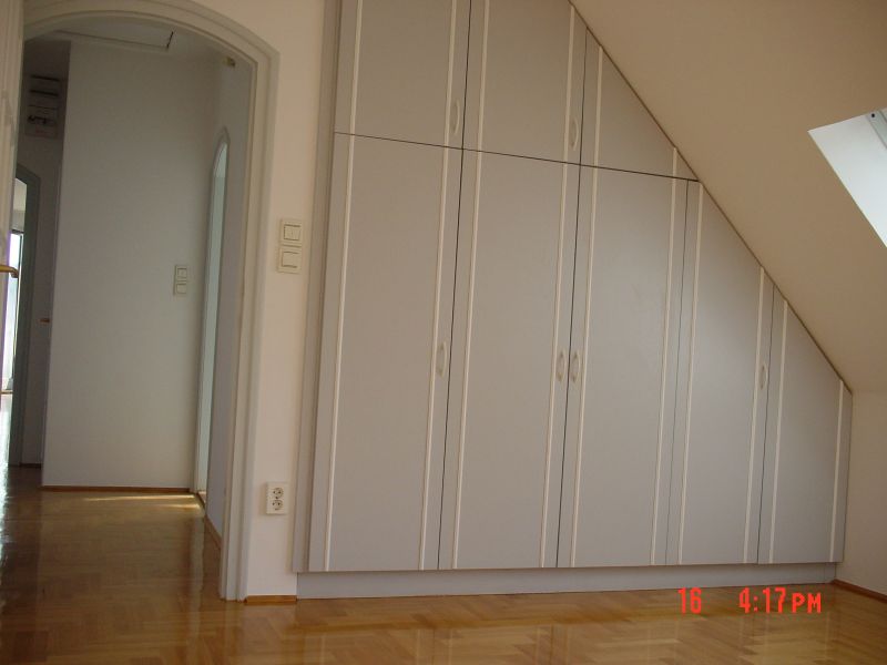 Gardrób szekrény egyedi kivitelben, tetőtérben. Asztalos munka